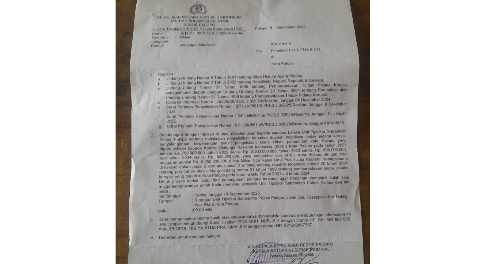 Dalam surat tersebut disebutkan, polisi tengah menyelidiki dugaan tindak pidana korupsi penyalahgunaan kewenangan dalam pengelolaan dana hibah Pemerintah Kota Palopo.