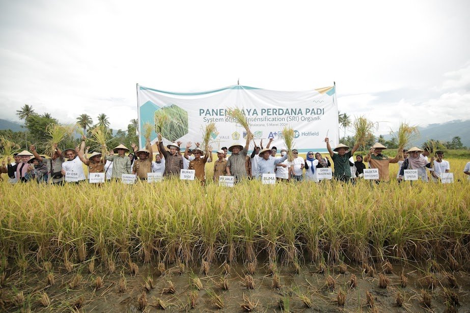 SIGI, TEKAPE.co – PT Vale Indonesia Tbk (PT Vale) dan Alkhairaat berkolaborasi bersama konsultan Corporate Social Responsibility (CSR) Aliksa Organik SRI Consultant (AOSC), A+ CSR, dan Hatfield melakukan panen perdana pertanian System of Rice Intensification (SRI) organik.