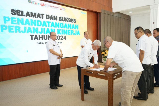 Sebelum membuka Rakorpem Bupati Asahan yang di dampingi Wakil Bupati Asahan menandatangani perjanjian kinerja tahun 2024 di awali Sekretaris Daerah Kabupaten dan di ikuti oleh seluruh OPD se-Kabupaten Asahan serta Camat se-Kabupaten Asahan