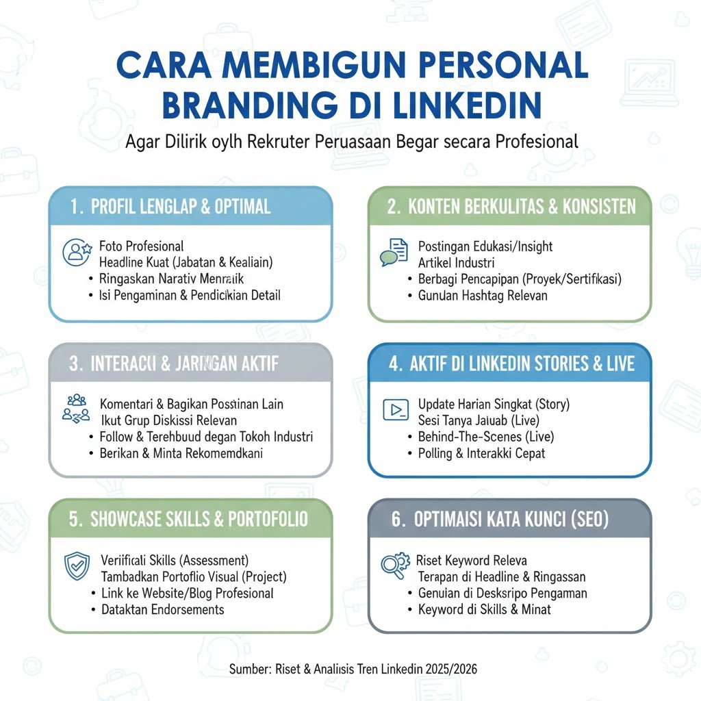 Di era digital yang berkembang pesat, LinkedIn bukan lagi sekadar platform untuk mengunggah riwayat hidup digital atau mencari lowongan pekerjaan secara pasif. Platform ini telah bertransformasi menjadi panggung utama bagi para profesional untuk membangun citra diri atau personal branding yang kuat. Bagi Anda yang mengincar posisi di perusahaan besar atau korporasi multinasional, profil LinkedIn adalah aset strategis yang menentukan kesan pertama di mata rekruter. Membangun personal branding yang efektif memerlukan pendekatan yang terukur, konsisten, dan autentik agar algoritma serta mata manusia dapat menangkap nilai unik yang Anda tawarkan.