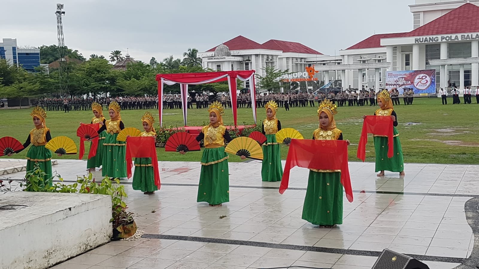 Tarian Suruganna Lino yang artinya Surganya Dunia ditampilkan pada perayaan HUT ke-78 Bhayangakara di Lapangan Pancasila Palopo, Senin 1 Juli 2024. (dok: polres)