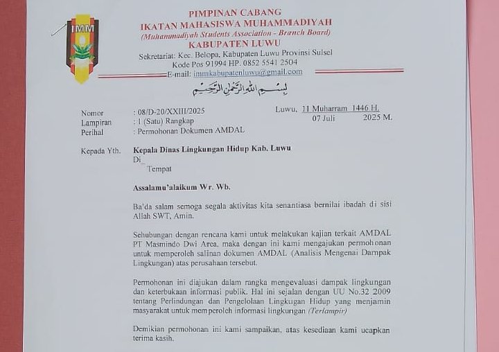 Melalui surat resmi yang dikirim ke DLH, IMM Luwu menegaskan bahwa keterbukaan informasi lingkungan bukanlah pilihan, tapi kewajiban negara sebagaimana diatur dalam Undang-undang No. 32 Tahun 2009.