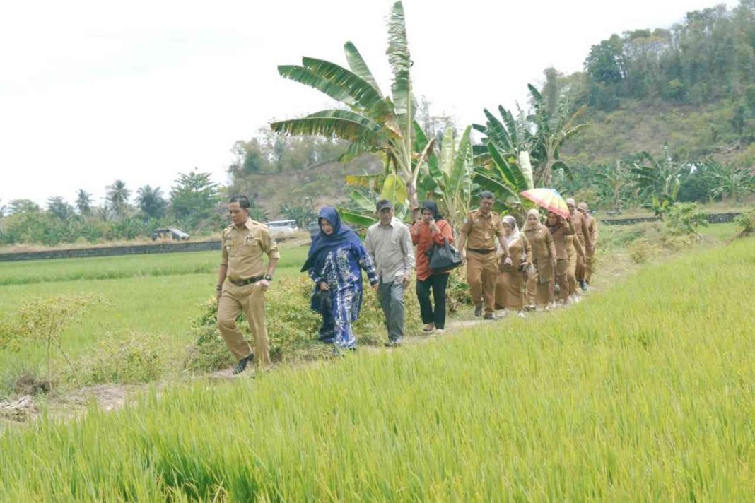 Melalui pematang sawah dibawah terik matahari, Hayarna bersama tim Dinas Pemberdayaan Masyarakat dan Desa menyerahkan bantuan dan meninjau langsung pada setiap lokasi kelompok penerima bantuan ternak kambing di Desa Buntu Kamiri Kecamatan Ponrang. Selasa, 12 September 2023.