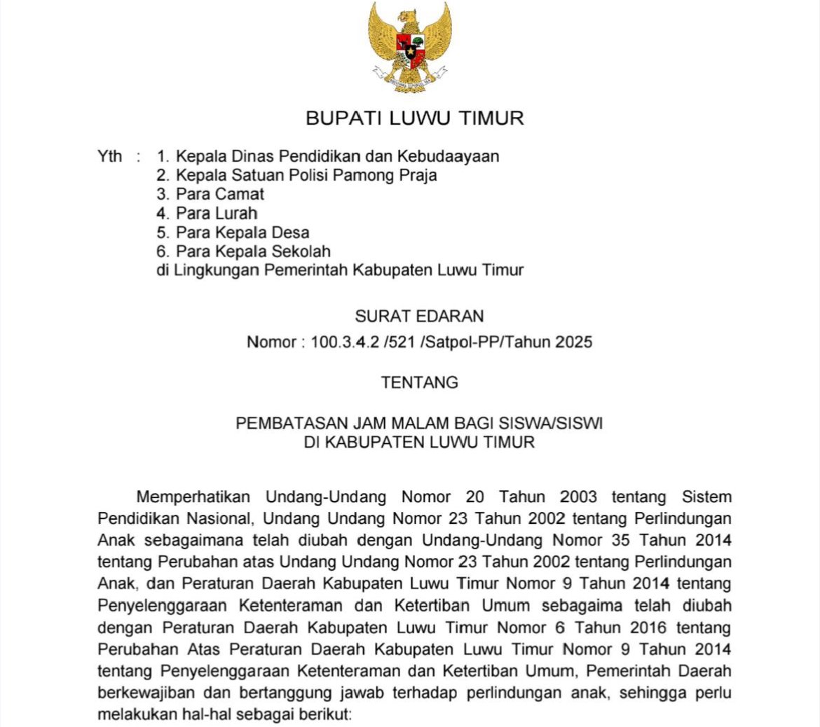 Sudat edaran Bupati Luwu Timur tentang pembatasan jam malam bagi pelajar di Luwu Timur. (ist)