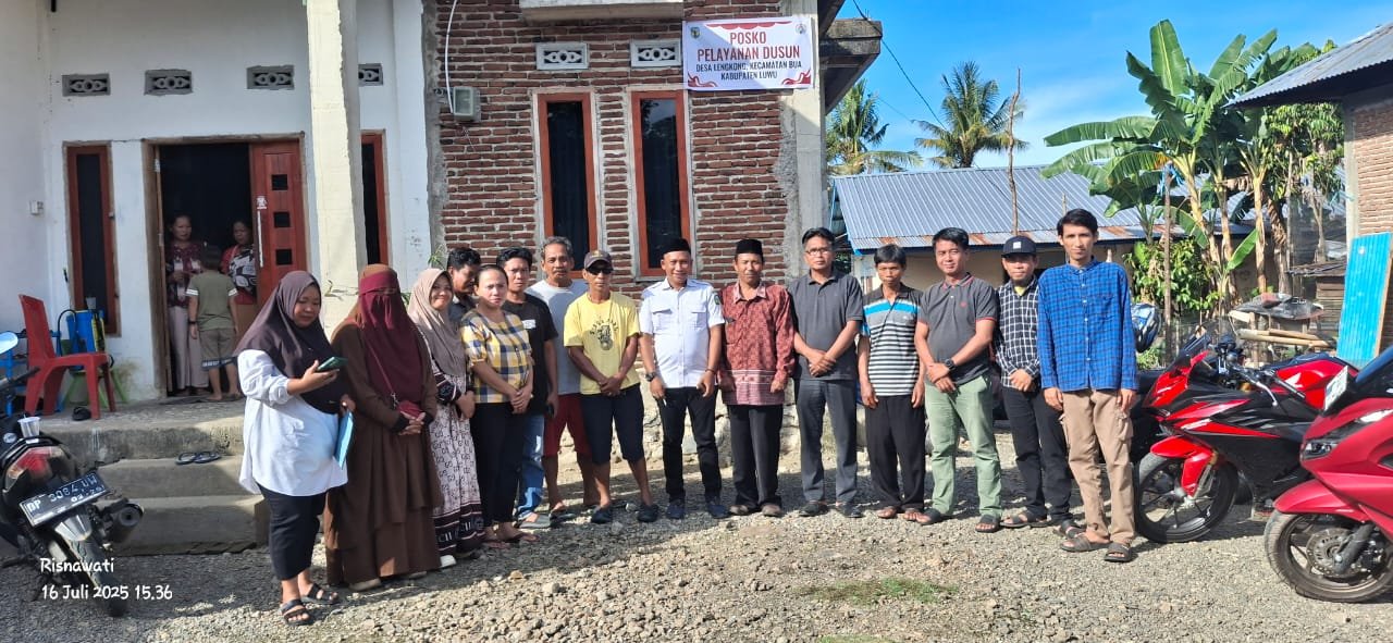 Penjabat Kepala Desa Lengkong, Muhammad Darussalam berfoto bersama warga di depan Posko Pelayanan Dusun di Desa Lengkong, Kecamatan Bua, Kabupaten Luwu, Rabu (16/7/2025). Posko ini didirikan untuk mempermudah masyarakat dalam mengakses layanan dan informasi dari pemerintah desa.