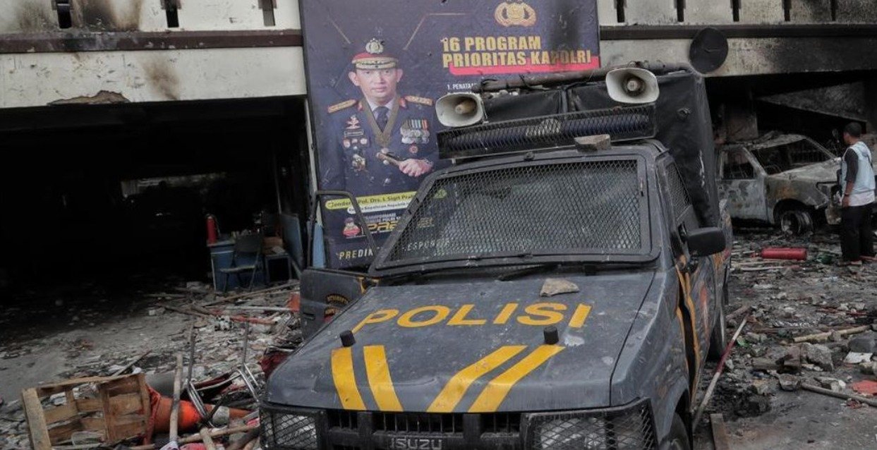 Aksi pembakaran kantor polisi ini merupakan buntut kemarahan massa atas tewasnya pengemudi ojek online, Affan Kurniawan.
