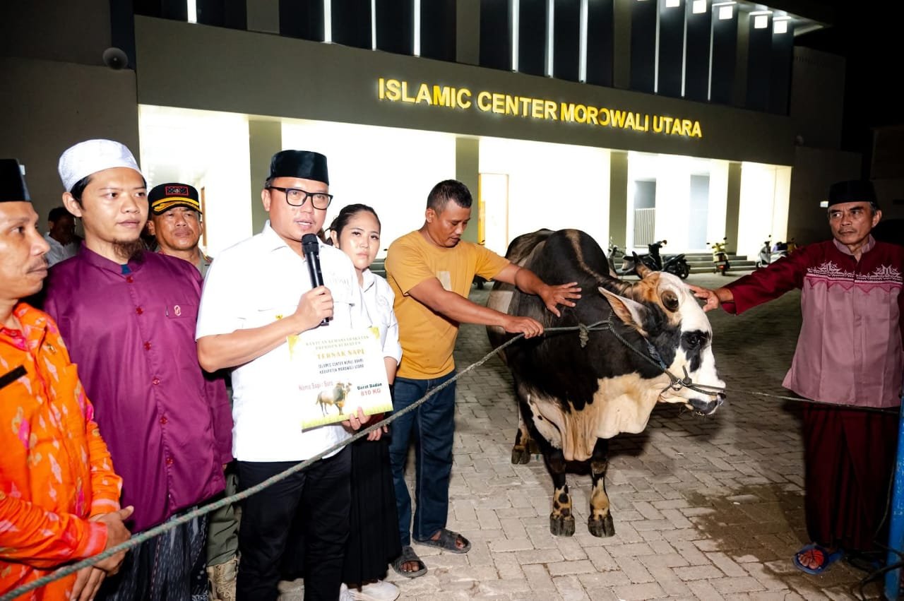 Prosesi penyerahan dilakukan oleh Bupati Morowali Utara, Delis Julkarson Hehi, bersama Ketua TP PKK Morut yang juga anggota DPD RI, Febriyanthi Hongkiriwang, kepada panitia kurban masjid setempat.