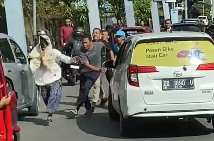 Tangkapan layar: Seorang pria mengenakan pakaian perempuan lengkap dengan kerudung, dikejar warga setelah gagal merampas mobil milik pegawai Otoritas Bandara Sultan Hasanuddin.