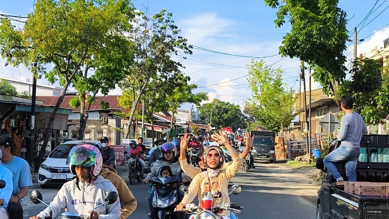 Konvoi yang melibatkan ribuan kendaraan berlangsung meriah dengan massa menggunakan pakaian berwarna biru putih bertuliskan ‘Palopo baru’ saat konvoi.