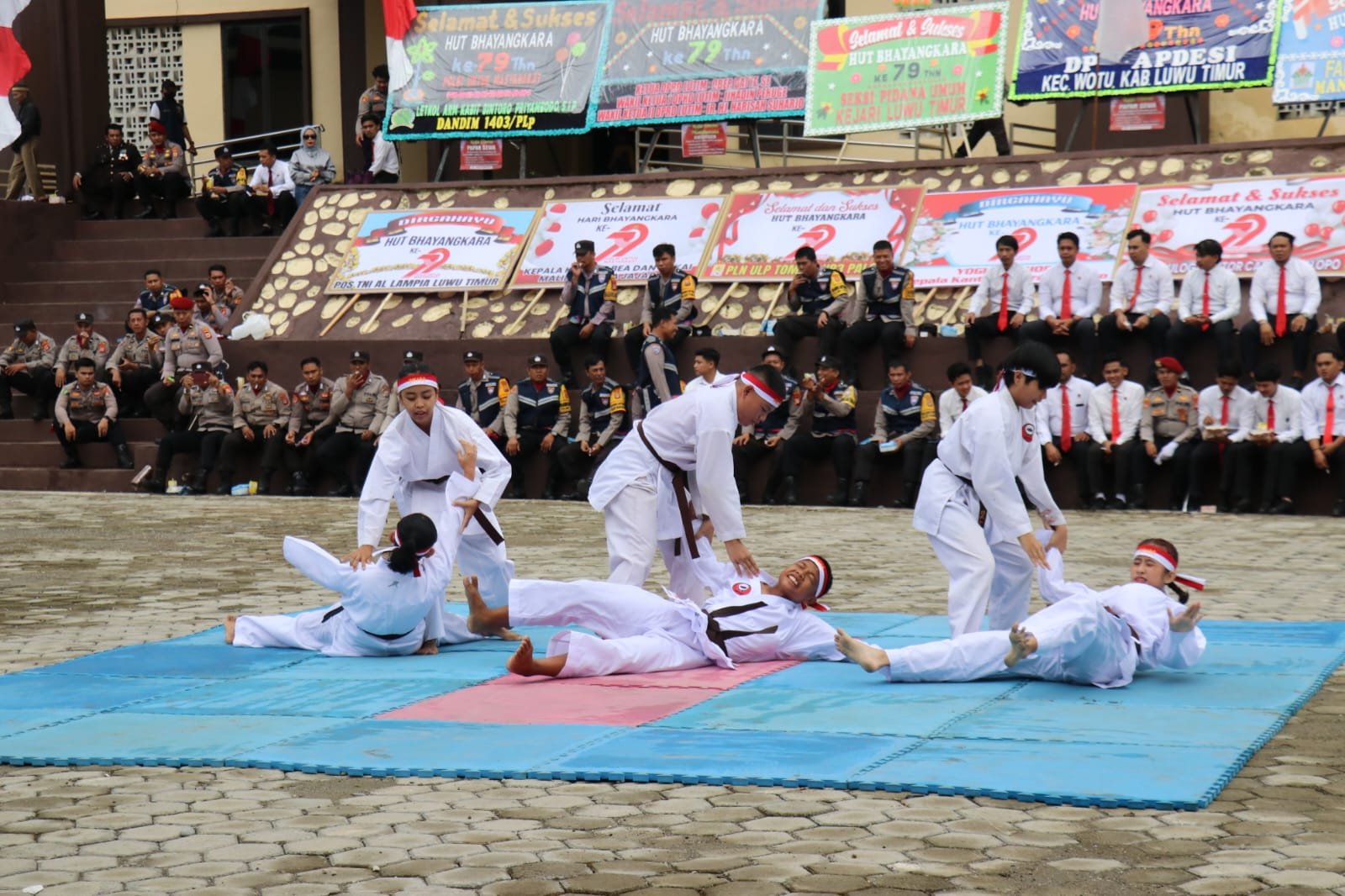 Atraksi beladiri pada peringatan Hari Ulang Tahun (HUT) Bhayangkara ke-79 yang digelar khidmat di halaman Kantor Polres Baru, Desa Puncak Indah, Kecamatan Malili, Selasa (01/07/2025). (hms)
