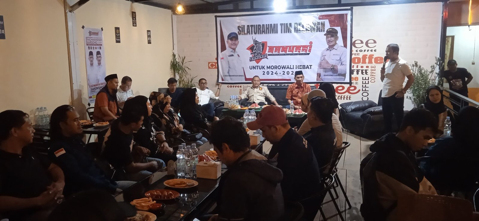 MOROWALI, TEKAPE.co – Suana gemuruh menandai kedatangan pasangan Calon Bupati/Calon Wakil Bupati Morowali periode 2024-2029, Ir HA Rachmansyah Ismail M.Agr MP-Drs Harsono Lamusa, saat menggelar acara silaturahmi di Kecamatan Bahodopi, Selasa (3/9/2024) malam, tepatnya Warkop Holla Coffee, Desa Keurea.