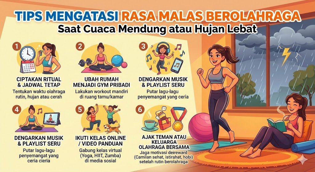 Cuaca mendung yang dingin atau rintik hujan yang berubah menjadi lebat sering kali menjadi alasan utama bagi seseorang untuk membatalkan jadwal olahraga. Suasana yang syahdu biasanya lebih mengundang kita untuk menarik selimut, menikmati minuman hangat, dan bermalas-malasan di tempat tidur. Namun, menjaga konsistensi aktivitas fisik sangat penting bagi kesehatan tubuh dan mental, terutama saat cuaca ekstrem yang rentan menurunkan imunitas. Rasa malas sebenarnya adalah tantangan psikologis yang bisa diatasi dengan strategi yang tepat dan penyesuaian lingkungan. Memahami cara memicu motivasi di tengah suasana mendung akan membantu Anda tetap bugar tanpa harus memaksakan diri keluar rumah dalam kondisi cuaca yang tidak mendukung.