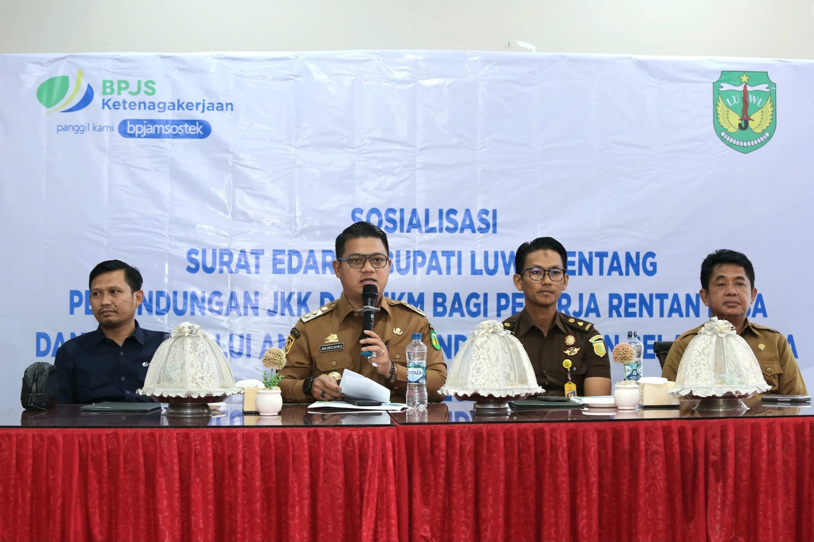 Wakil Bupati Luwu, Muhammad Dhevy Bijak Pawindu, memberikan sambutan pada kegiatan Sosialisasi Surat Edaran Bupati Luwu tentang Perlindungan JKK dan JKM bagi Pekerja Rentan Desa melalui BPJS Ketenagakerjaan, di Mega Plaza Palopo, Selasa (16/9/2025). (ist)